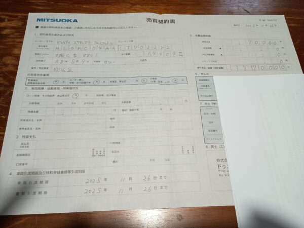 バイクの「売買契約書」です。右下は個人情報が記載されているので隠しています。右上に「70,000」の金額が記載されています。現車を確認したかったのですが、別の保管場所にあるそうなのであきらめました。お別れは本当に突然でした。