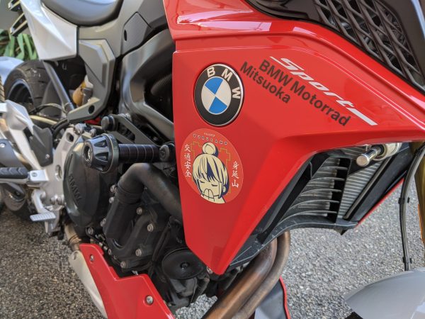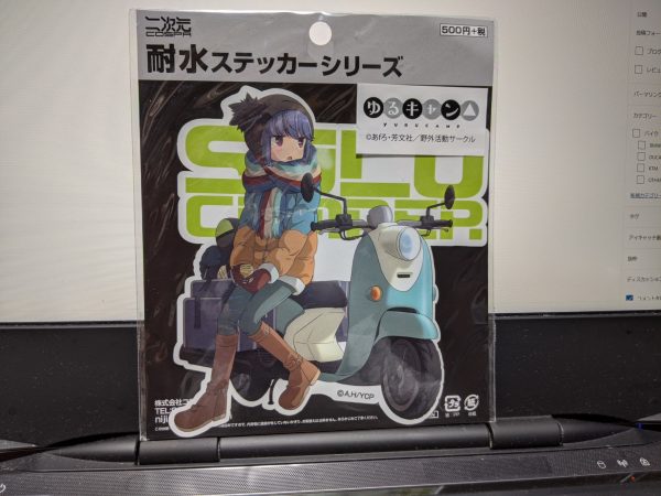 ツーリングで、M氏から「ゆるキャン△」の志摩リンステッカーを2枚いただきました。1枚は見延山の交通安全ステッカーで、もう1枚はリンちゃんがスクーターに座っているやつです。