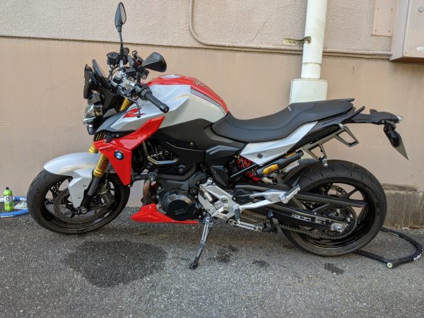 過酷なツーリングで、バイクがドロドロになったので洗車しました。車の洗車は点検時にディーラーがやってくれたのですが、バイクは自分でやるしかないです。おかげで綺麗になりました。(地面のシミは落ちた水滴のせいです。)