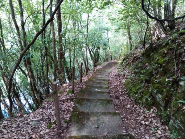 案内看板から滝に降りる階段は、こんな感じです。こちらも苔むしているので、滑りやすいです。