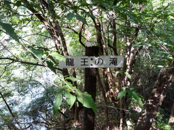 「龍王の滝」に到着。実際はこの案内看板から、さらに降ります。バイクを駐めた場所から約5分です。