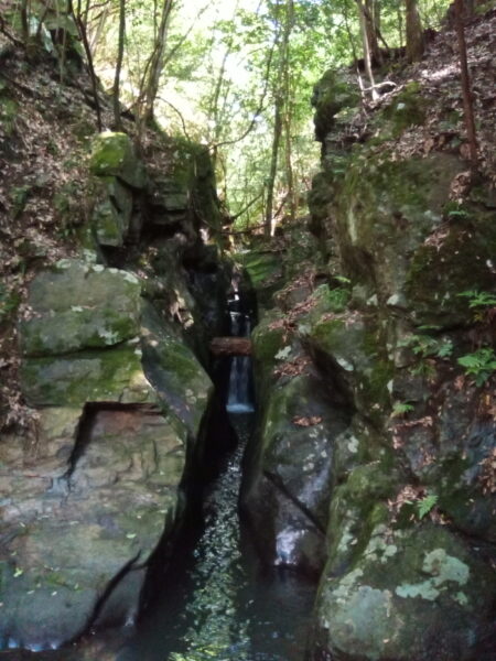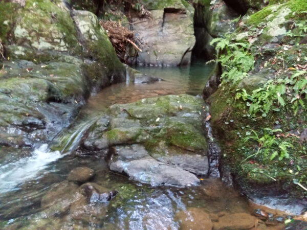 滝を少しでも近くで撮影するために滝壺付近の岩に登ったのですが、降りるときに滑って転びました。川には落ちませんでしたが、苔むした岩にライダーシューズはやばいです。(中央にあるのがすっころんだ岩です。右手の岩に登って滝を撮影していました。)