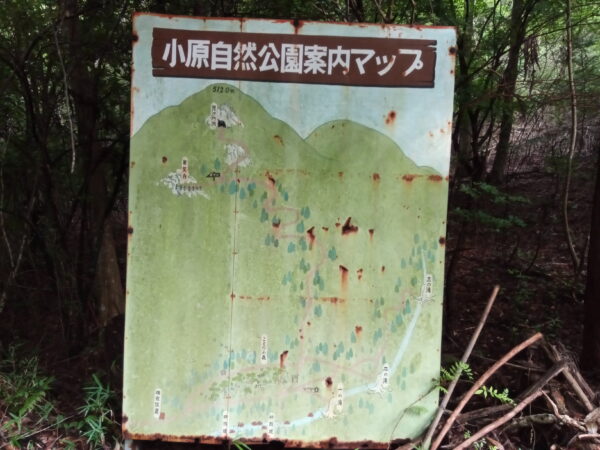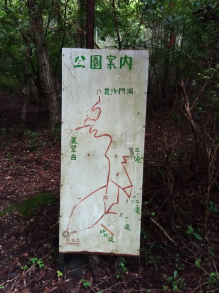 「毘沙門の滝」は「小原自然公園」にあり、公園の案内看板があります。「毘沙門の滝」の名前は山の上に「毘沙門洞」があるからですね。わたしは滝が目的なので「毘沙門洞」には行っていません。「毘沙門の滝」は「一ノ滝」「二ノ滝」「三ノ滝」とあるみたいです。「公園案内」に書いてある鳥居は本当にありました。