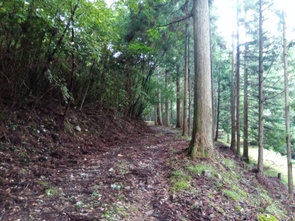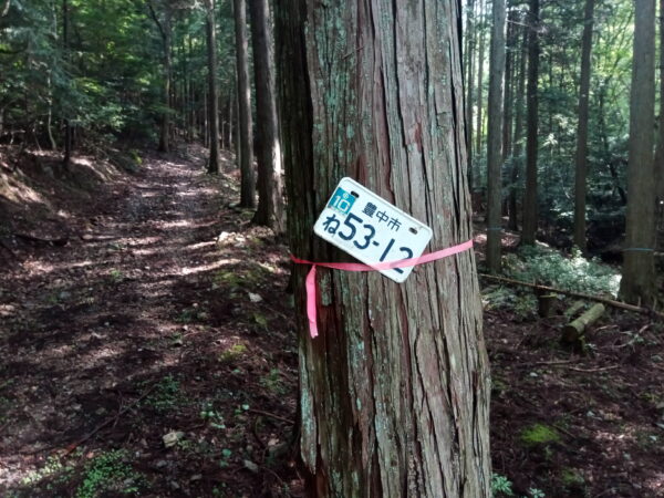 まずは「一ノ滝」を目指します。ちょっと荒れていますが、軽トラなら走れそうな林道です。途中で木に原付のナンバープレートが飾ってありました。林道を走った振動で落下したんでしょうね。