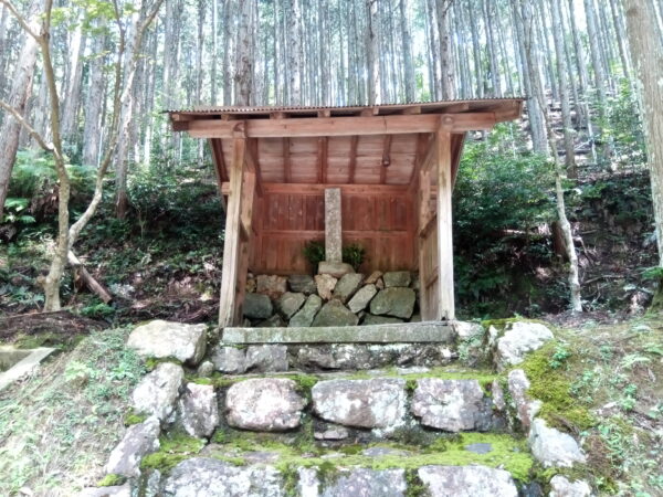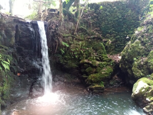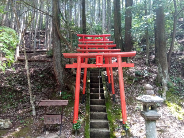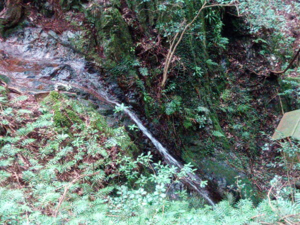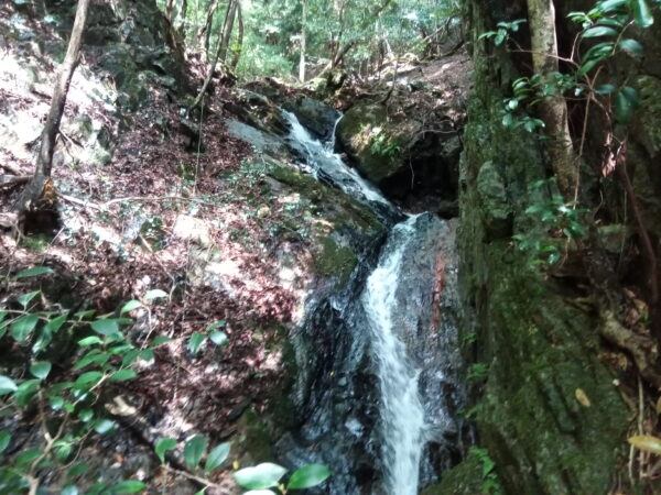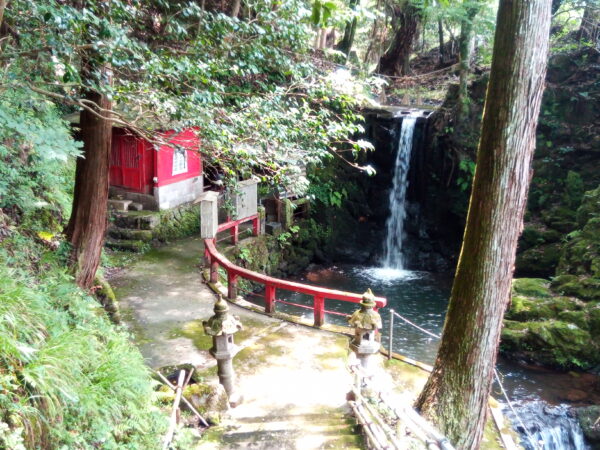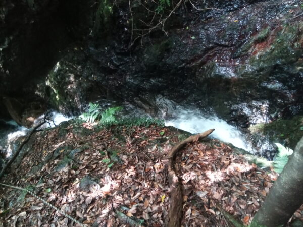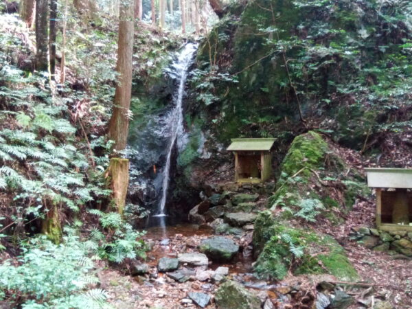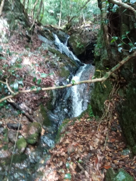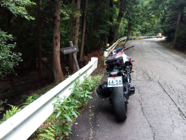 無事3つの滝を見学したので、バイクを駐めた場所に戻りました。往復で約37分でした。途中で「一ノ滝」を上から見ることができる場所があります。(右側に祠が見えるので、「一ノ滝」に間違いないです。)