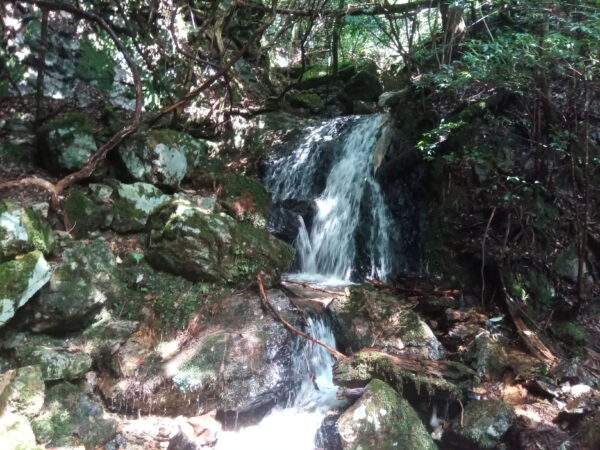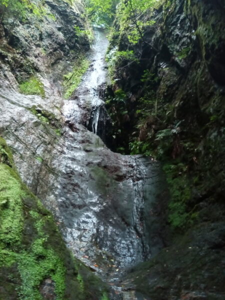 「おのぶの滝」に到着。バイクを駐めた場所から約20分です。写真をよく見ればわかるのですが、左手にロープが張られています。つまり「まだ上がある」ということなのですが、谷川を滑落する未来しか見えなかったため、ここで引き返しました。