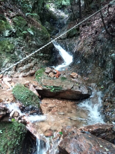 途中からロープが張られており、軍手をはめてマジの渓流登りになります。