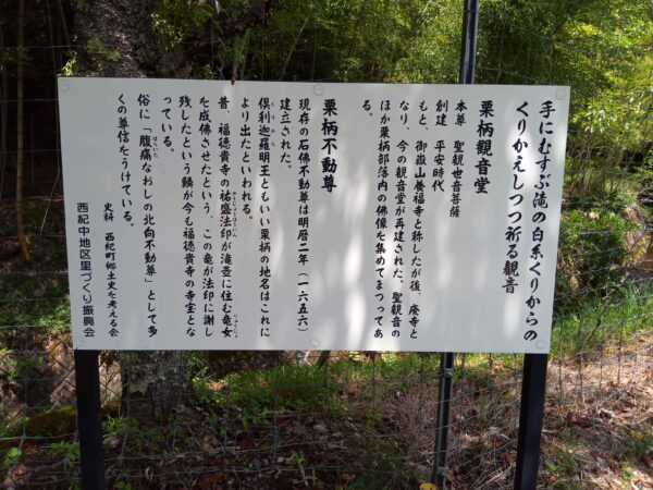 最後は「俱利伽羅(くりから)不動の滝」です。この滝は「栗柄(くりから)観音堂」からすぐの場所にあります。「栗柄観音堂」は県道69号線と97号線の交差点付近から細い道を入ったところにありますが、グーグルマップが道として認識していないため、「栗柄観音堂」を目的地にすると変な場所に案内されてしまいます。