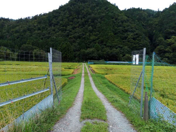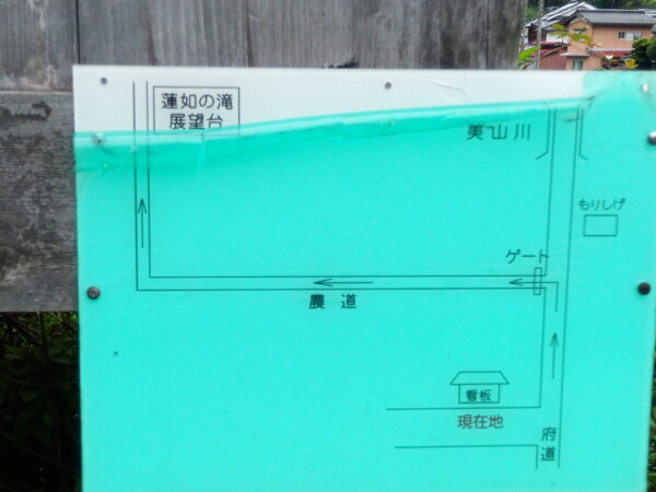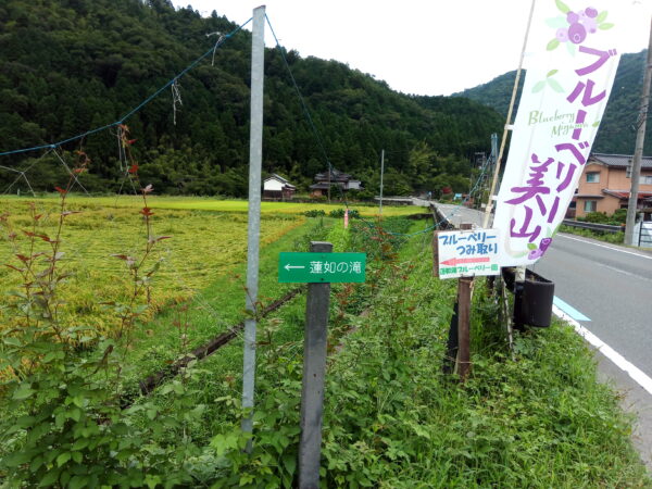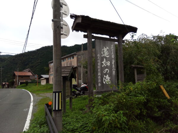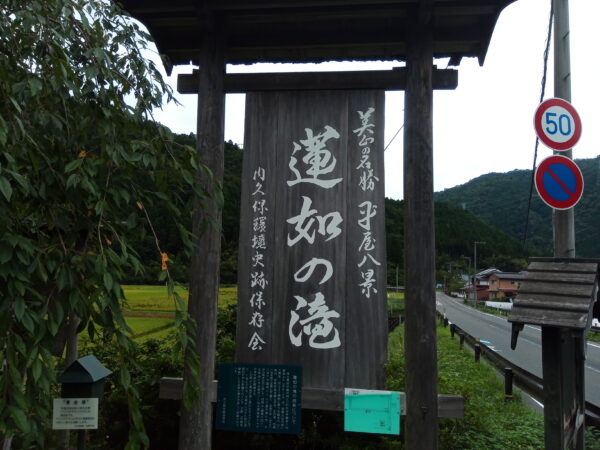 徒歩で「蓮如の滝」に向かいます。府道から曲がる場所に案内看板があり、その先の農道を突き当たると、右への案内看板があります。