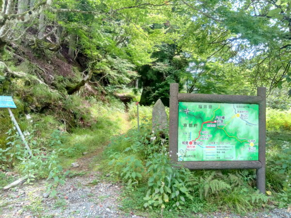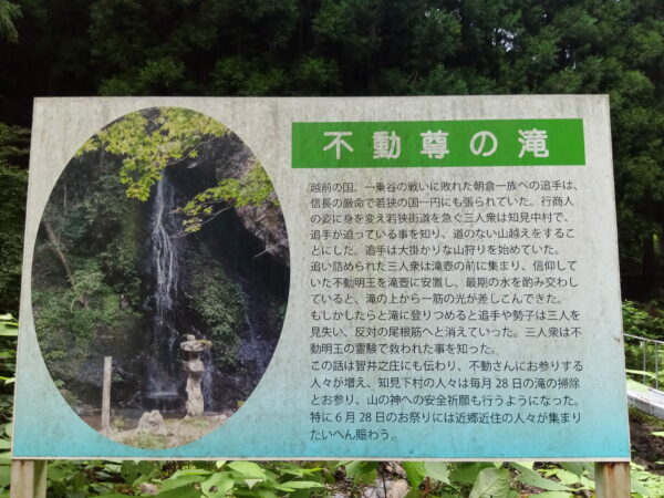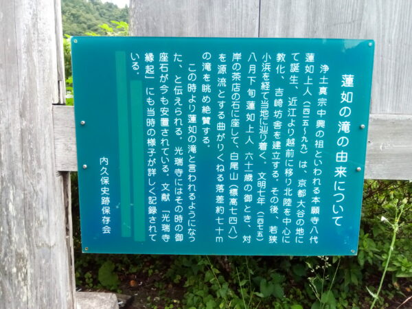 駐車場には「蓮如の滝」まで案内看板と滝の由来の説明看板があります。