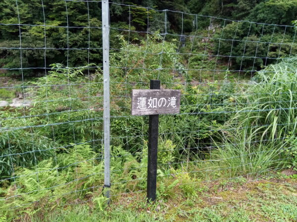 「蓮如の滝」に到着。バイクを駐めた場所から約5分です。滝は由良川の対岸にあり、さらに害獣防止のネットがあるため、これ以上近づけません。