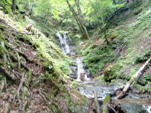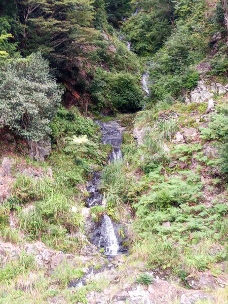 さらに進むと左手の下方に滝が見えます。初めはこれが「不動尊の滝」かと思ったのですが、案内看板もないし、降りる道も見当たらないので違うと判断して、先に進みました。
