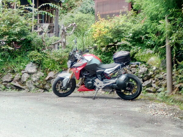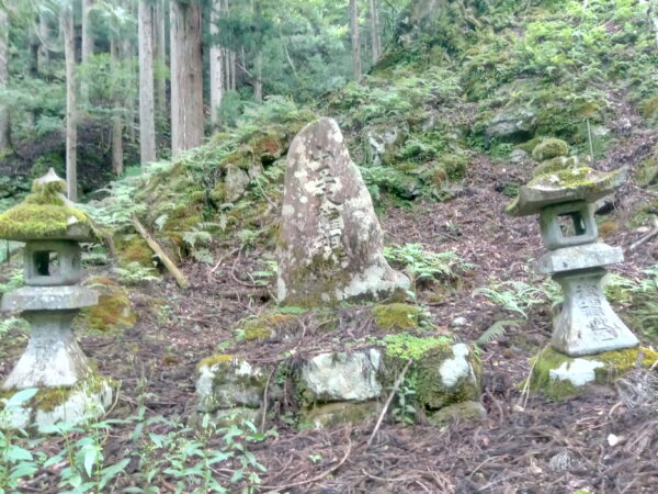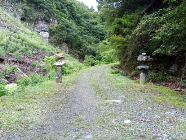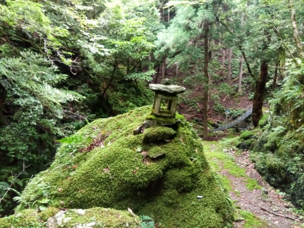 林道(ダート)を5分くらい走ると不動尊の灯籠があります。(オンロードバイクなのでノロノロ運転です。)