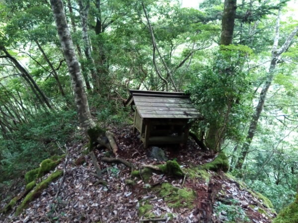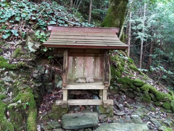 スイッチバックの坂を約9分登ると、小さな祠が2つあります。