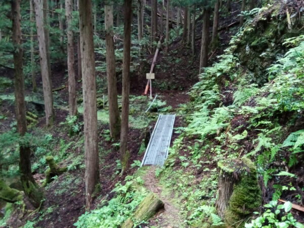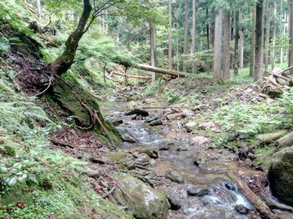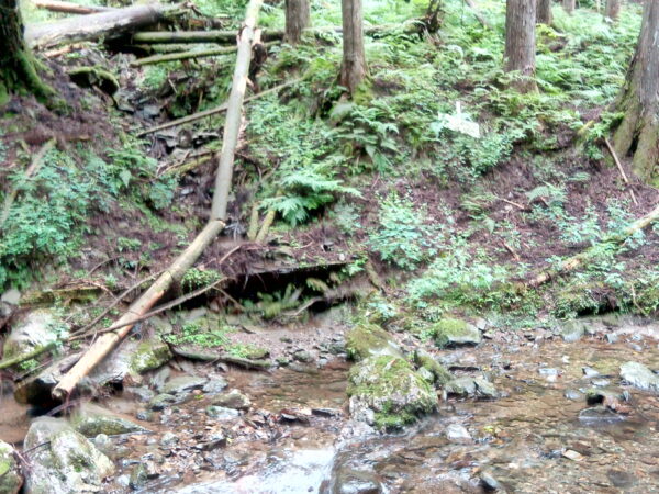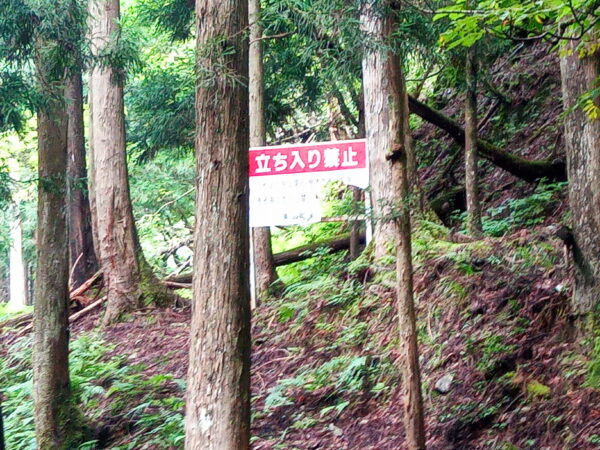 ここも川を渡るポイントです。倒木が多いのがわかりますね。「小滝」はこの川の右手にあるのですが、滝からの川との合流点の向こうには「立ち入り禁止」の看板がありました。その先には「雄滝」と「雌滝」あるのですが、遭難したくないのであきらめました。
