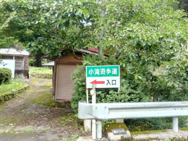 林道を戻って、府道369号線との交差点を左折して、府道の終点まで走ります。バイクは「小滝遊歩道」の案内看板の手前に駐めました。この看板の右手に行くと駐車スペースらしきものがあります。この遊歩道は、特に整備されているわけではなく、何カ所か案内看板があるだけで、あとは川沿いに進んでいけばなんとかなるって感じでした。