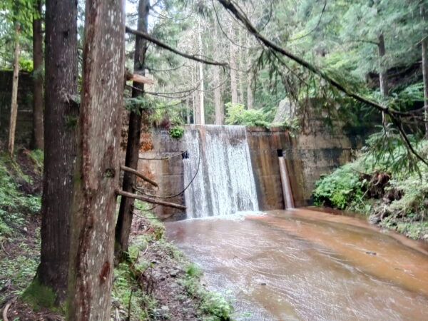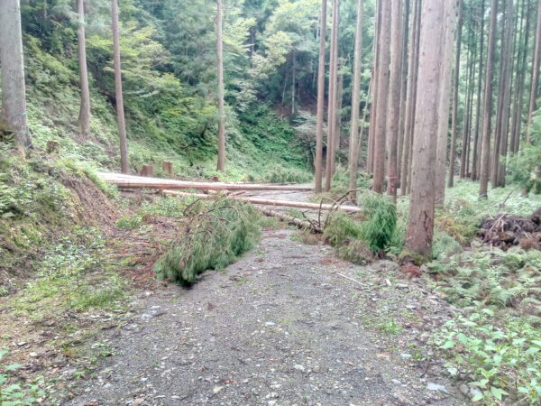 帰りは砂防ダムのところで川を渡らず、そのまま進んでみました。林業の作業場になっているみたいで、皮を剥いだ木材が置いてありました。(倒木ではありません。)