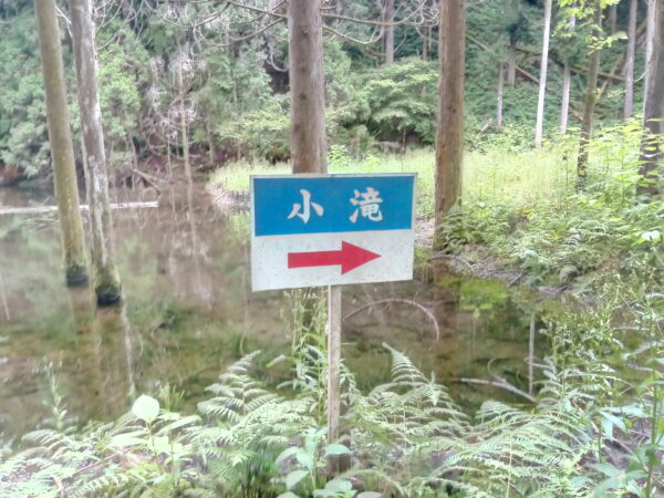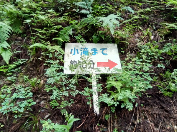 川を渡るポイントのひとつです。なぜここで渡ったかというと、写真右上にあるひっくり返った案内看板が見えたからです。看板は「小滝」まで約10分の案内でした。(もちろん表向きに直しておきました。)