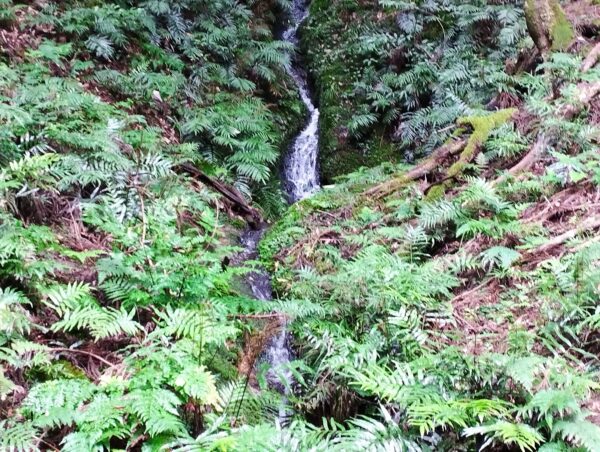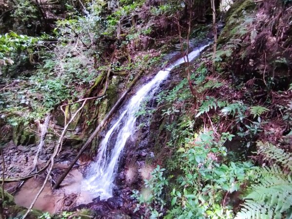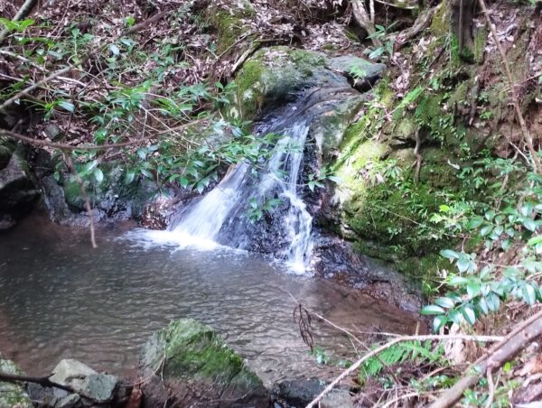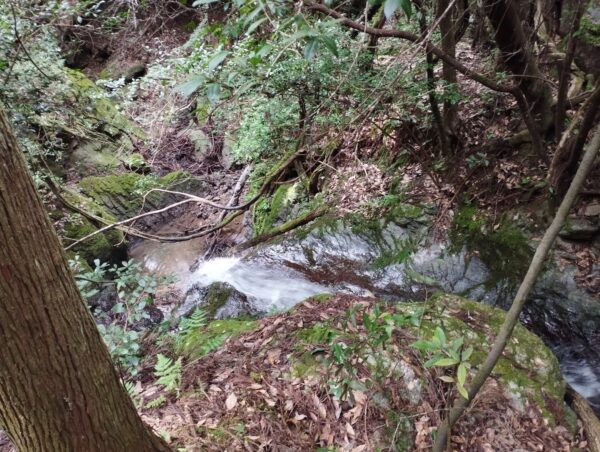 上流(バイクを駐めた場所の方)から滝を見下ろすと、こんな感じです。また、上流にも小さな滝がありました。