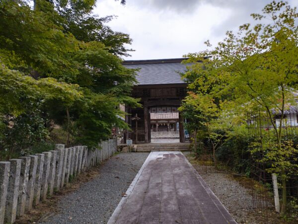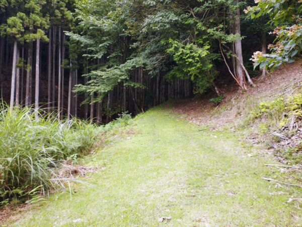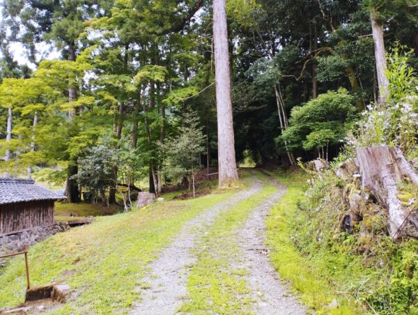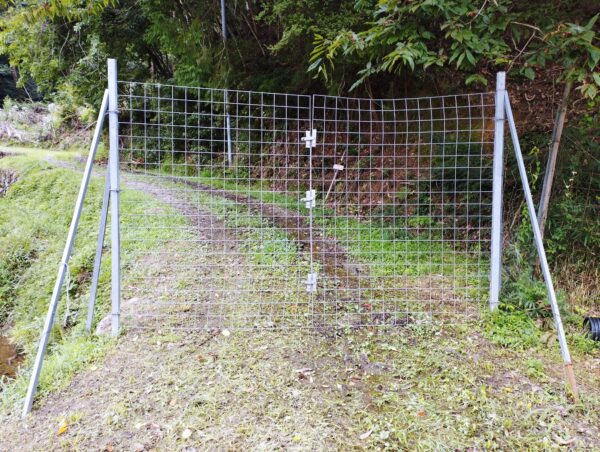 神社の右横の林道を進むと害獣防止フェンスがあり、開閉して進みます。また、神社内からであれば、このフェンスの向こう側に出ることができます。林道は進むにつれて少しずつ細くなり、最終的に登山道になります。