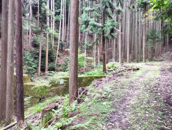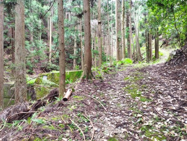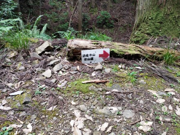 「胎金寺山登山道」の案内看板があり、本格的に登山道っぽくなります。もう車が走れる林道ではありません。