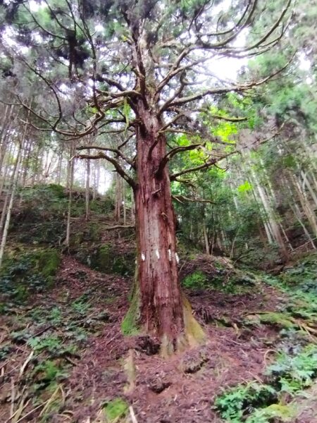 「口の天狗杉」に到着。びっくりするくらい立派な御神木ですね。バイクを駐めた場所から約15分です。
