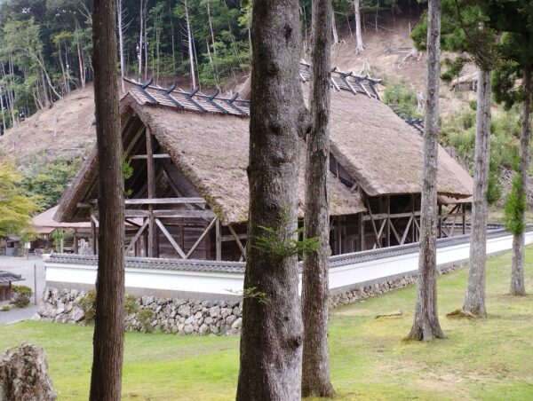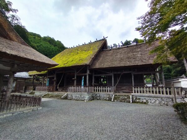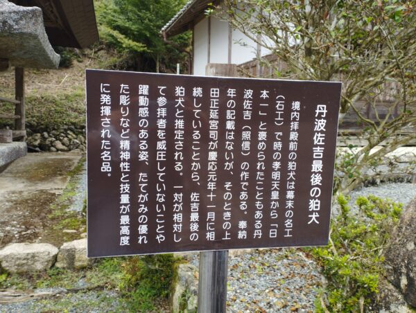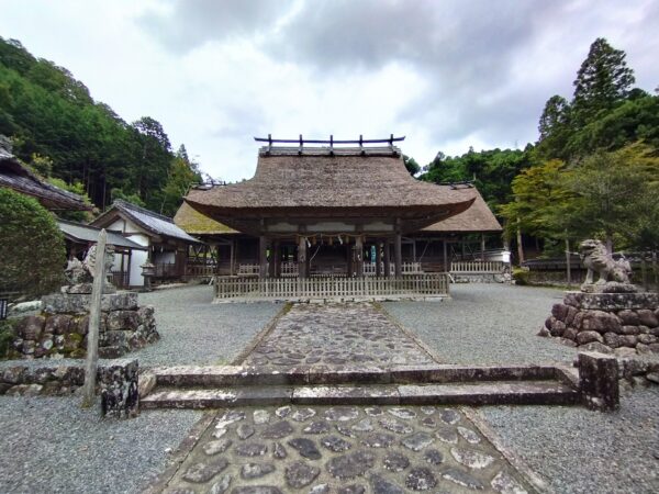 上の写真の門をくぐって、本殿のある境内に入ります。有名な石工の狛犬があったり、歴史を感じさせてくれる神社です。本殿は茅葺きの社で覆われています。