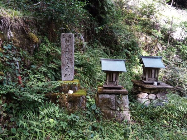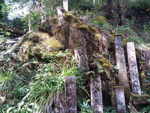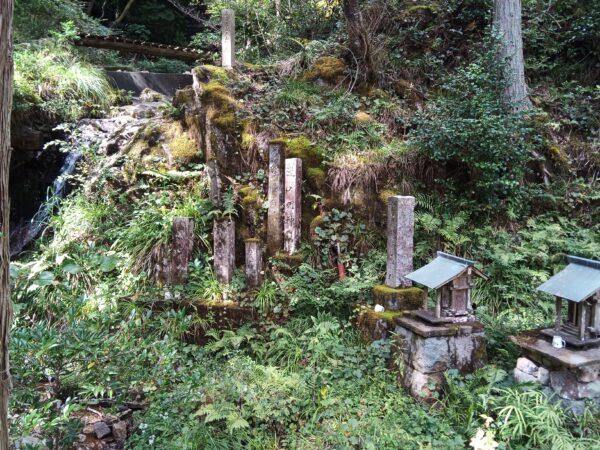 「音羽の滝」に到着。林道をたっぷり歩いたので、約15分かかりました。滝の周りには祠や石碑が建ち並んでいます。