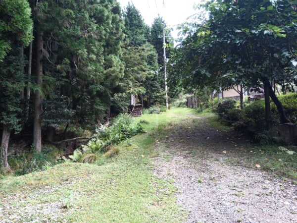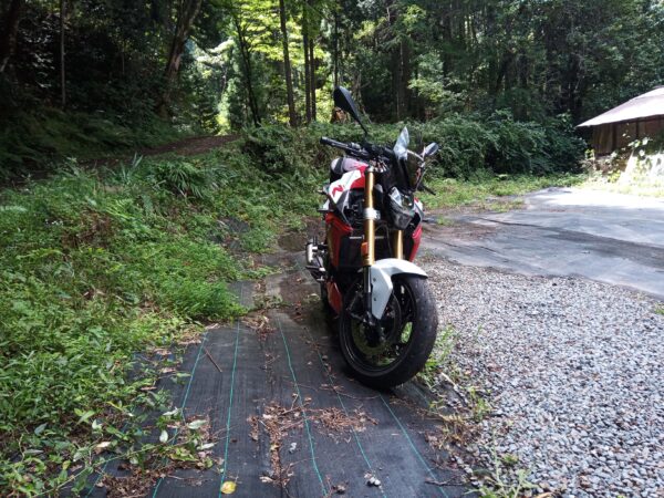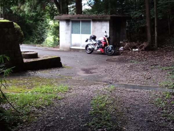 林道を走るのは嫌なので、Uターンして別荘風の家の前にバイクを駐めました。
