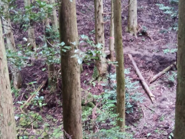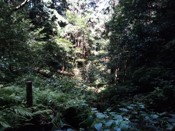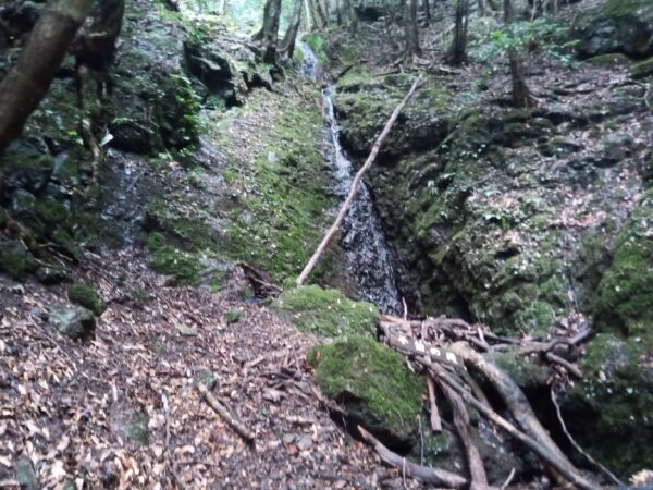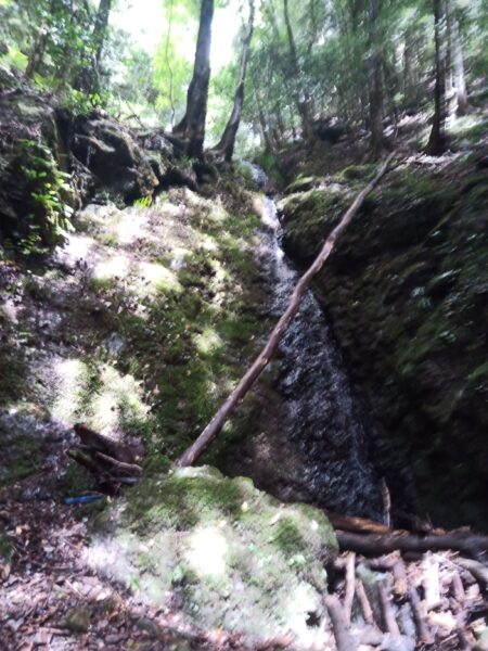 「松尾山住山登頂口」に到着。バイクを駐めた場所から約9分です。実はこの場所は2つの川の合流点であり、「住山不動滝」は登山道を歩いて右手の川沿いにあるのですが、何を勘違いしたのか左手の川沿いに無理矢理進んでしまいました。「登山道なのに道なき道だなあ」などと寝言を言いながらグーグルマップを確認したら間違いに気づきました。2枚目の写真の正面に見える山を越えて、本来の登山道に戻りました。