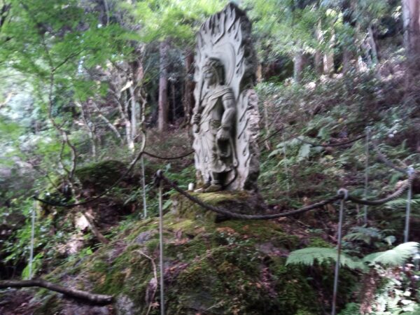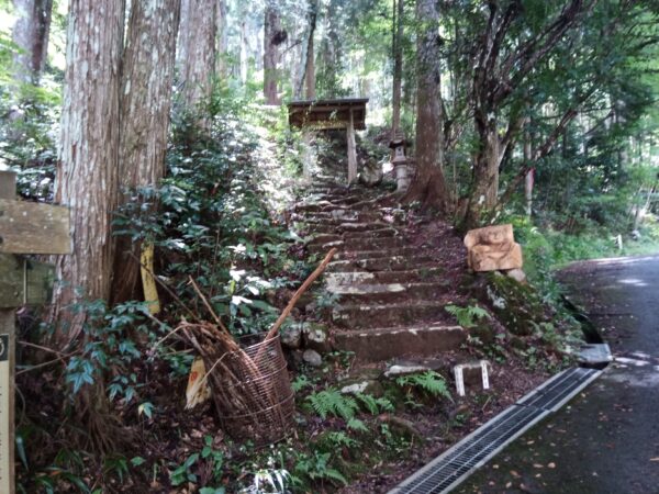 歩き出してすぐ右手に見える階段は「龍蔵寺愛宕堂」へ向かう道のようでした。杖が置いてあると言うことは、結構険しい道のりなのかも知れません。