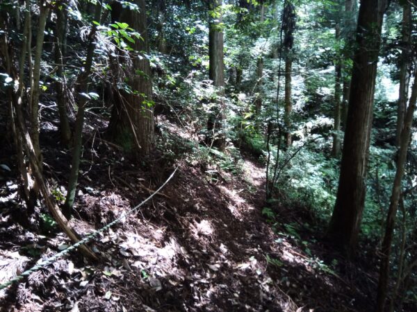 「不動堂」の右側から登っていきます。下の写真のように黒黄のトラロープが張ってあるため、道に迷うことはありません。ただ、足元の地面が柔らかいため、かなり滑ります。