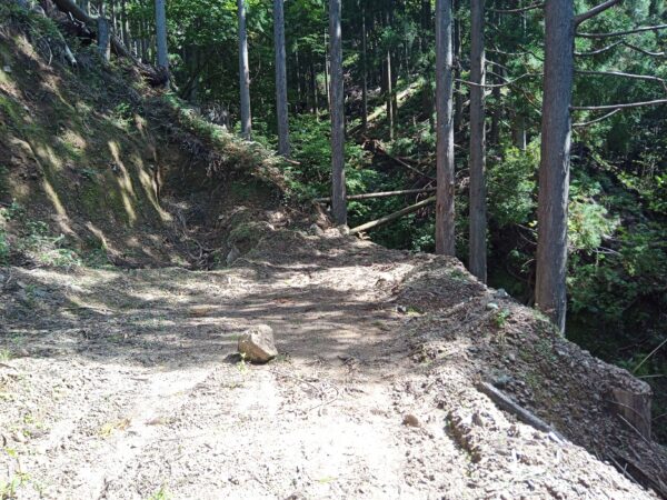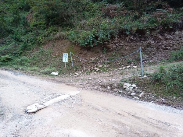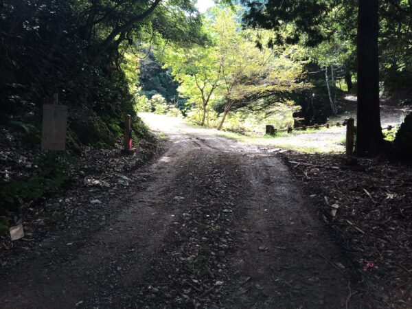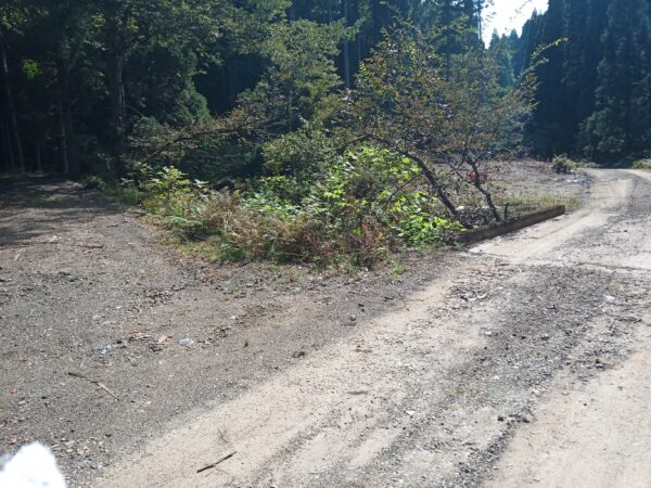 再び左折してメイン林道を進むと、チェーンを張れる支柱のある場所がありました。さっきの分岐点から約9分です。ブログの記述はこの先の分岐を左に2km行けと言うことかと合点がいったので、「八反の滝」を目指す気力が出てきました。