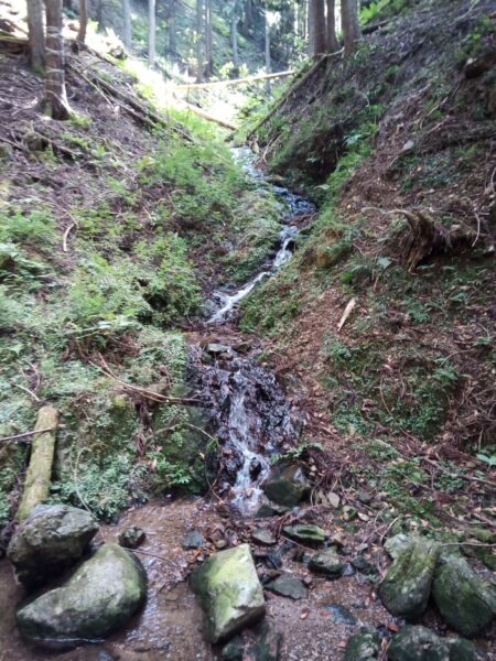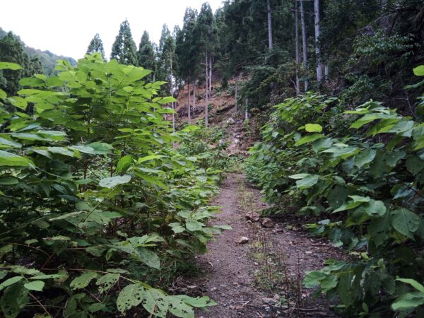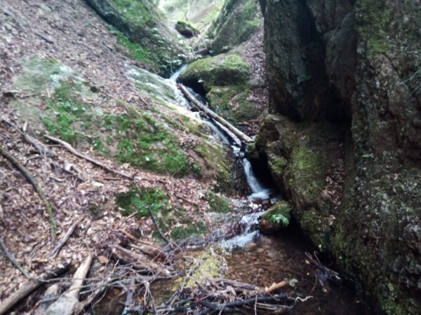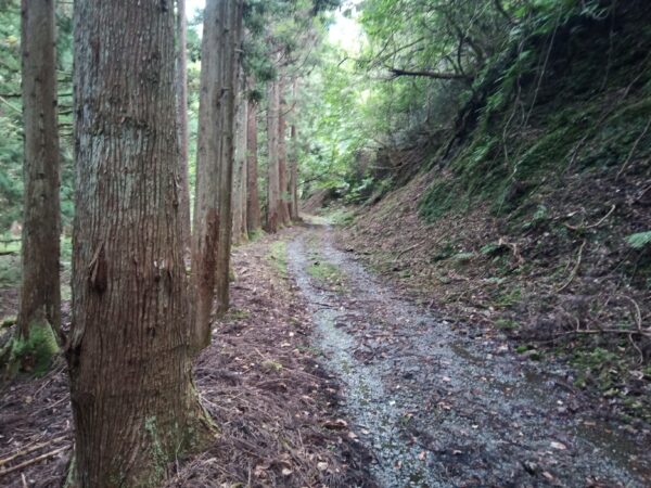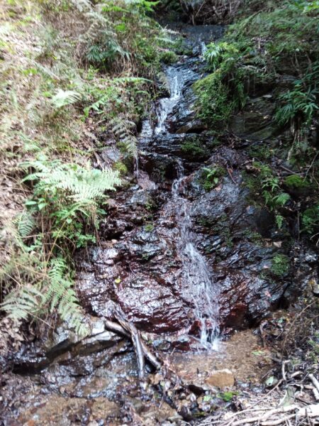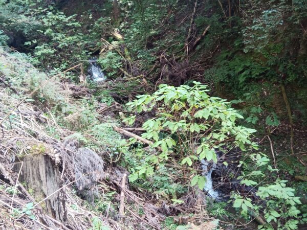 メインの林道を約5分歩くと左側に林道があったので、左折して林道の終点を目指します。支流沿いに進むと、小さな滝が見えるのですが、林道が高い位置にあるため降りることができません。林道は延々と続くのですが、20分くらい歩いても滝がある感じがせず、林道が山の方へ登っていくので戻ることにしました。