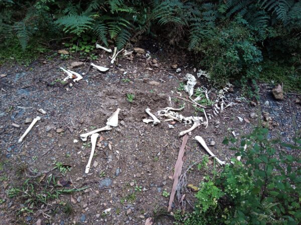 チェーンの先は左の林道を行き、林道終点の左側支流に「八反の滝」があるということでしたので、最初の分岐点を左(橋を渡る)に曲がりました。林道には獣の白骨死体が転がっており、自然の厳しさを感じます。野生の鹿も走っていました。