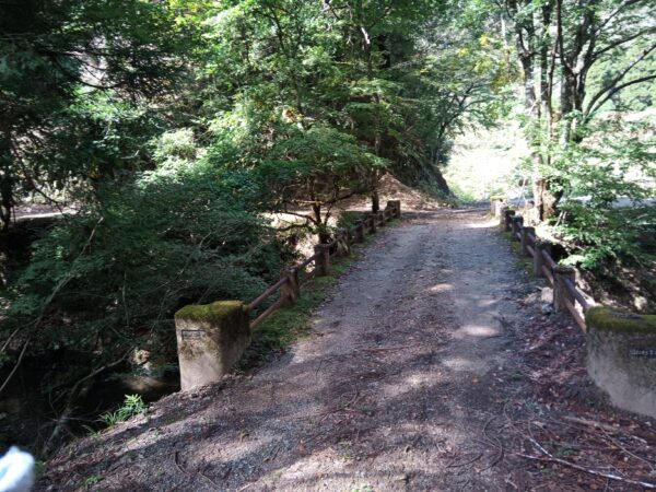 メイン林道を左へ曲がった分岐点に戻ってきました。バイクを駐めた場所から林道の終点まで往復して約54分経過しています。この時点では、左へ曲がるところを間違えたと思っていたので、橋を渡って左折して、メインの林道をさらに奥に向かいます。