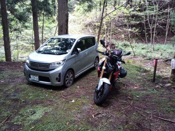 バイクを駐めた場所に戻ってきました。途中で昼食を食べましたが、全行程で約2時間47分でした。無名の滝でもいくつかの滝を観ることはできたのですが、「八反の滝」にはたどり着けずに終わりました。