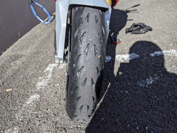 交換完了。料金は、以下のとおりでした。バイクのタイヤって高いよね。工賃は、外国車の場合、少し割高です。タイヤの写真は自宅に帰ってから撮影したのですが、スポーツタイヤなのに溝が深く刻んであり、雨のツーリングでも安心な感じです。タイヤの皮むきは、この大寒波が過ぎてからですね。