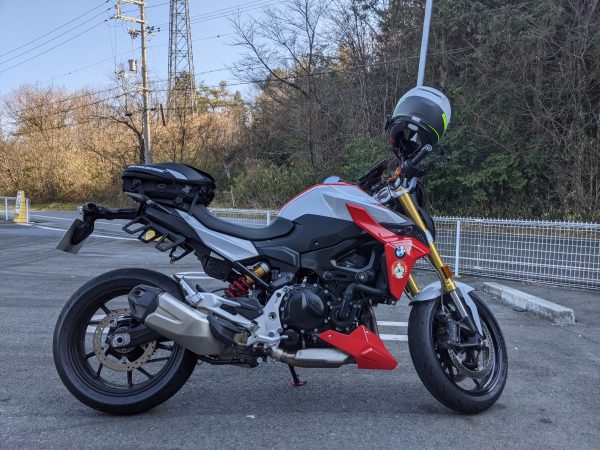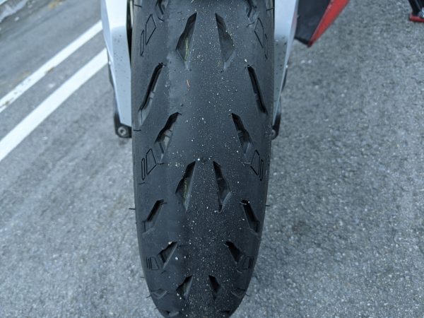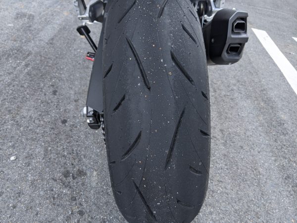 で、肝心のタイヤの皮むきですが、リアタイヤはあと1cmくらいですかね。メーターをスポーツモードにして走りましたが、バンク角は最大38度くらいでしたね。