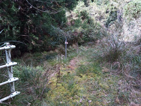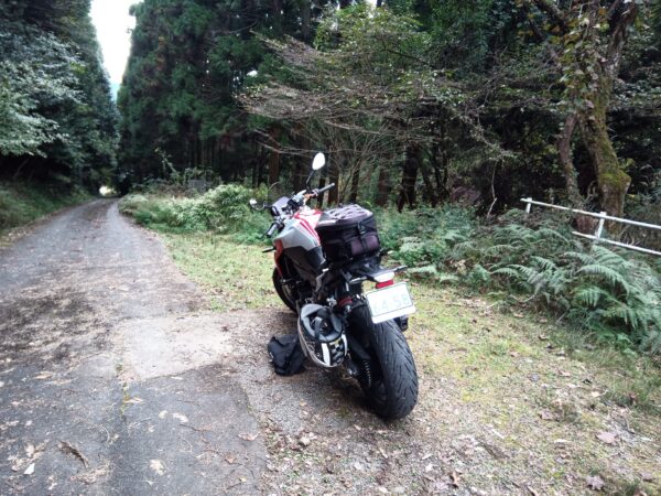 保守用の道の入口に到着、そこから林道を歩いてバイクを駐めた場所に戻りました。保守用の道の入口から「藁無城址」への往復は約55分でした。(昼食は5分くらい。)