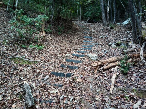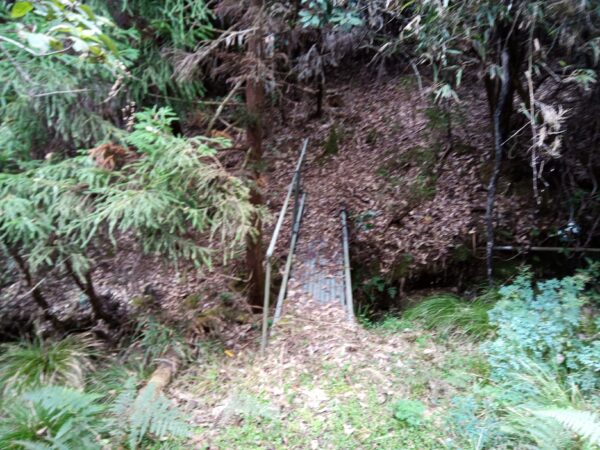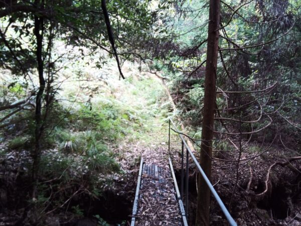 「高山城址」の登り口の反対側に、「藁無城址」へ向かう送電鉄塔の保守用の道がありました。一度降って、橋を渡って城山に登ります。こちらの保守用の道もプラスティックの箱のようなもので階段が造られていました。