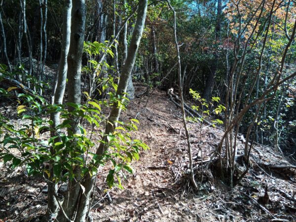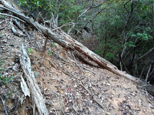 倒木で保守用の道が見えなくなっている場所です。正面の倒木を乗り越えれば道があるのですが、見えないため、ここから直登りしてしまいました。