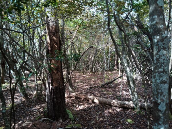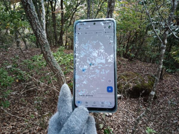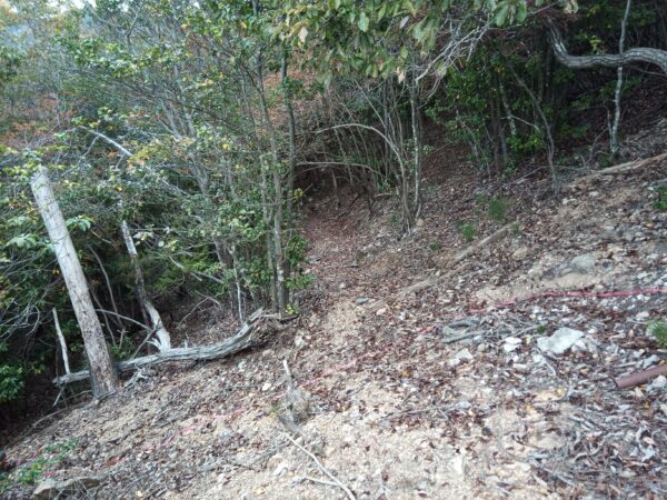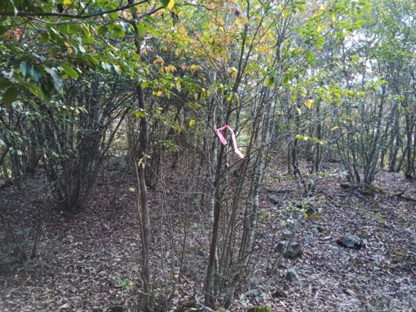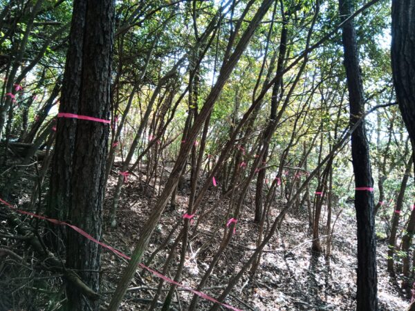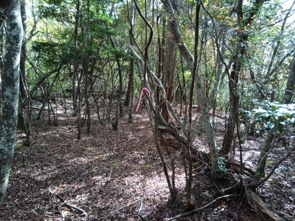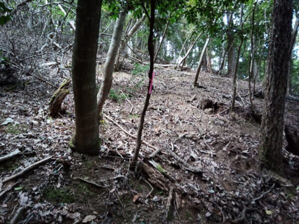 「高山城址」に到着。林状態で、説明看板等はありません。位置はグーグルマップで確認し、目印として赤いリボンを結んでおきました。バイクを駐めた場所から約30分かかりました。
