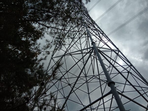 帰り道に反対側に山の送電鉄塔が見えました。位置的にこの山に送電鉄塔があってもおかしくないのになあと思い、赤いリボンのエリアの真下に降りてみると送電鉄塔がありました。この時点で、どこかで保守用の道を間違えたことに気づきました。