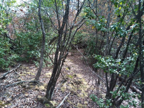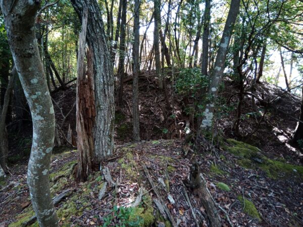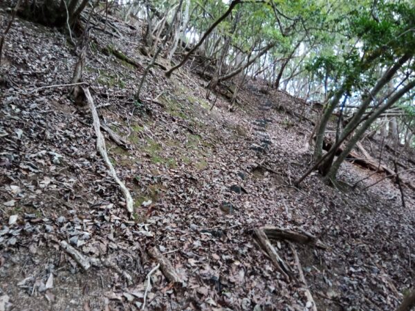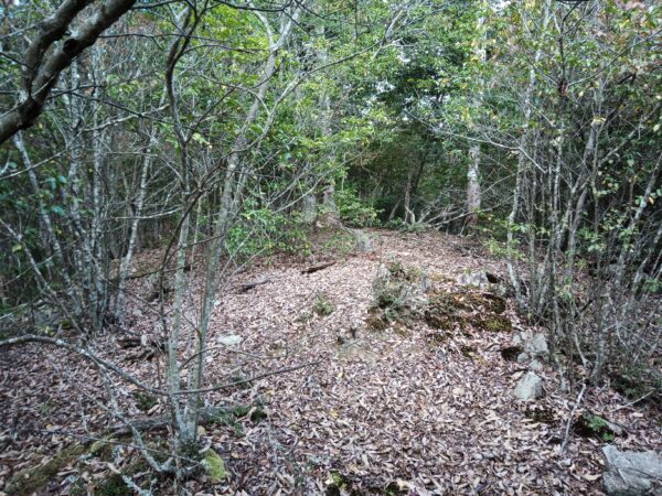 「藁無城址」は、送電鉄塔から尾根沿いに南の端まで進んだところにあります。途中に堀切と思われるところもありました。