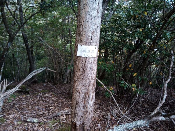 「藁無城址」に到着。林状態ですが、攻城した方が説明看板(紙製)を設けてくれていました。わたしも目印として赤いリボンを結んでおきました。保守用の道の入口から約23分かかりました。