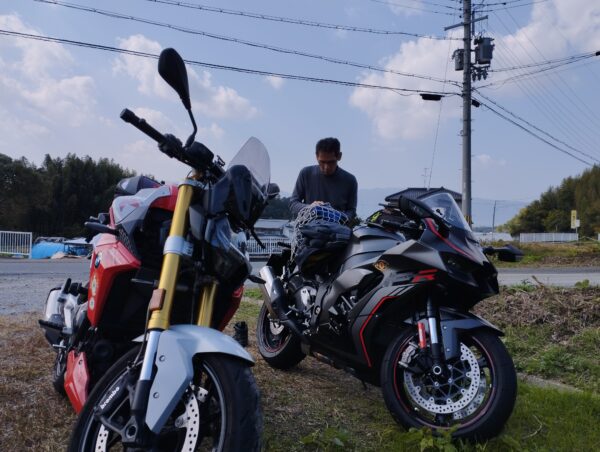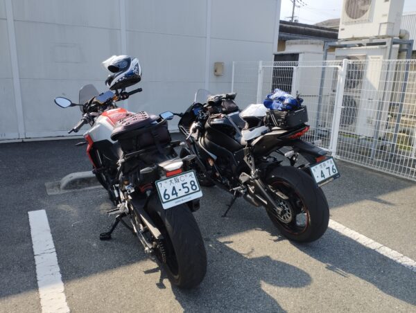 集合は「ローソン香芝上中店」です。ここで昼食を調達して、「高取城址」の「第2観光駐車場」で食べる予定です。隣のバイクは、奈良在住のツーリング仲間です。