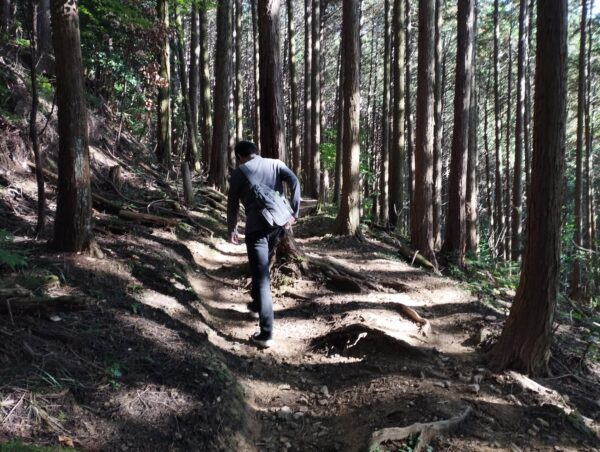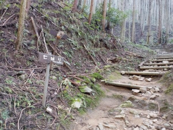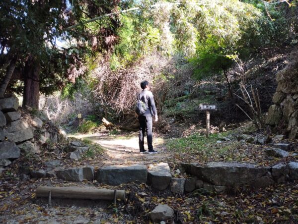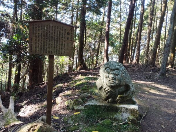 復路は「高取・明日香ハイキングコース」を通ります。「千早門跡」「宇陀門跡」「松ノ門跡」「矢場門跡」「二の門跡」を抜けて、「猿石」です。そこからは「七曲り」と言うくねくねとした山道を降ります。