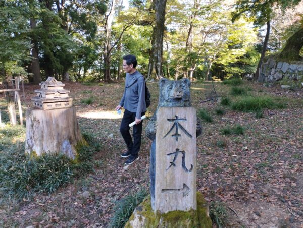 「十五間多門跡」を抜け、「太鼓櫓跡」を通ると「本丸跡」までもう少しです。「本丸→」の看板や天守の彫刻は、木に直接彫りだしたもののようです。