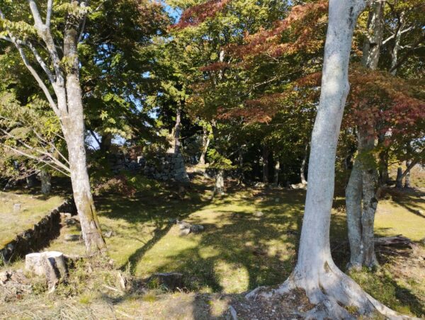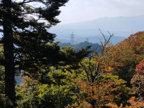 「本丸跡」に到着。「第2観光駐車場」から約1時間35分かかりました。山の中に見えている塔は「高取デジタルテレビ中継局」です。